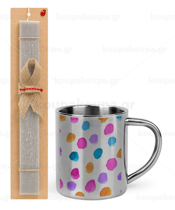 Watercolor dots, Πασχαλινή Λαμπάδα με μεταλλική κούπα θερμό (300ml) & κερί αρωματικό πλακέ (30cm) (ΓΚΡΙ)