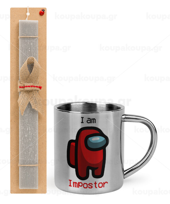 Among US i am impostor, Πασχαλινή Λαμπάδα με μεταλλική κούπα θερμό (300ml) & κερί αρωματικό πλακέ (30cm) (ΓΚΡΙ)