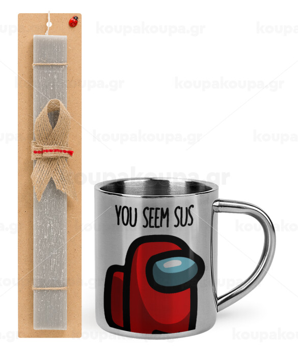 Among US, you seem sus, Πασχαλινή Λαμπάδα με μεταλλική κούπα θερμό (300ml) & κερί αρωματικό πλακέ (30cm) (ΓΚΡΙ)