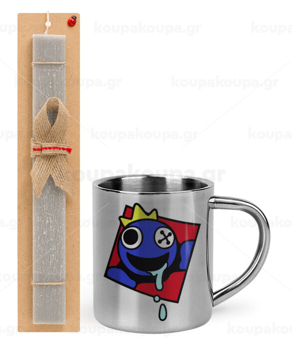 Blue, Rainbow friends, Πασχαλινή Λαμπάδα με μεταλλική κούπα θερμό (300ml) & κερί αρωματικό πλακέ (30cm) (ΓΚΡΙ)