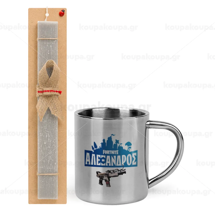 Fortnite with gun με το όνομα σου, Πασχαλινή Λαμπάδα με μεταλλική κούπα θερμό (300ml) & κερί αρωματικό πλακέ (30cm) (ΓΚΡΙ)