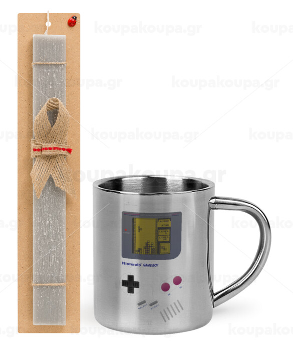 Gameboy, Πασχαλινή Λαμπάδα με μεταλλική κούπα θερμό (300ml) & κερί αρωματικό πλακέ (30cm) (ΓΚΡΙ)