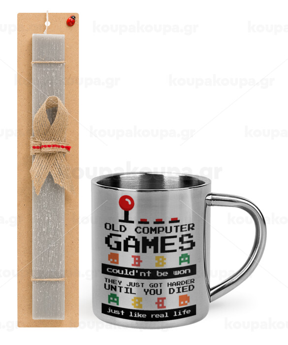 OLD computer games couldn't be won just like real life!, Πασχαλινή Λαμπάδα με μεταλλική κούπα θερμό (300ml) & κερί αρωματικό πλακέ (30cm) (ΓΚΡΙ)