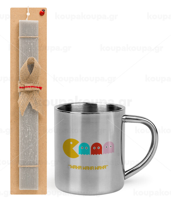 Pacman waka waka waka, Πασχαλινή Λαμπάδα με μεταλλική κούπα θερμό (300ml) & κερί αρωματικό πλακέ (30cm) (ΓΚΡΙ)
