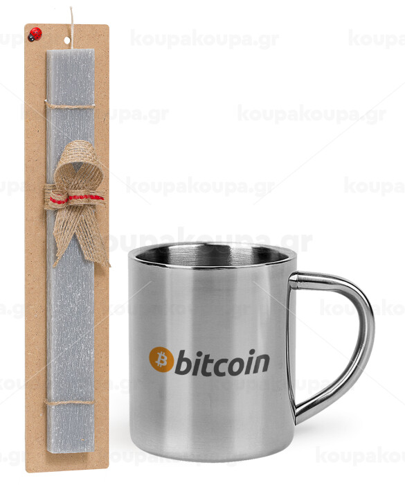 Bitcoin Crypto, Πασχαλινή Λαμπάδα με μεταλλική κούπα θερμό (300ml) & κερί αρωματικό πλακέ (30cm) (ΓΚΡΙ)