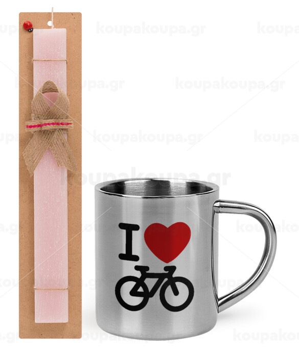 I love Bike, Πασχαλινή Λαμπάδα με μεταλλική κούπα θερμό (300ml) & κερί αρωματικό πλακέ (30cm) (ΡΟΖ)
