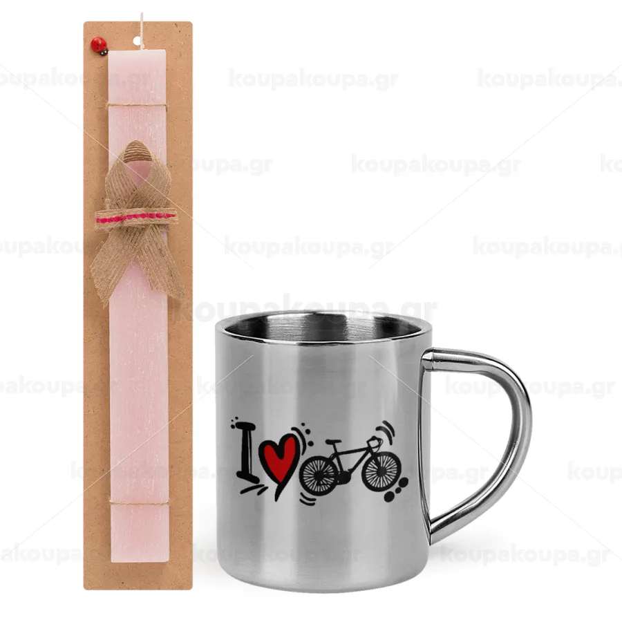 I love my bike, Πασχαλινή Λαμπάδα με μεταλλική κούπα θερμό (300ml) & κερί αρωματικό πλακέ (30cm) (ΡΟΖ)