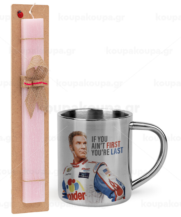 If You Ain't First You're Last Ricky Bobby, Talladega Nights, Πασχαλινή Λαμπάδα με μεταλλική κούπα θερμό (300ml) & κερί αρωματικό πλακέ (30cm) (ΡΟΖ)