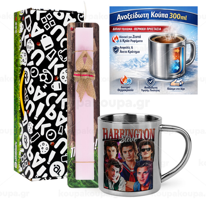 Steve Harrington, Stranger Things, Πασχαλινή Λαμπάδα με μεταλλική κούπα θερμό (300ml) & κερί αρωματικό πλακέ (30cm) (ΡΟΖ)