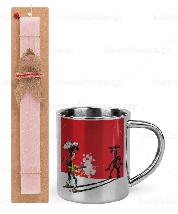 Λούκυ Λουκ σκιές, Πασχαλινή Λαμπάδα με μεταλλική κούπα θερμό (300ml) & κερί αρωματικό πλακέ (30cm) (ΡΟΖ)