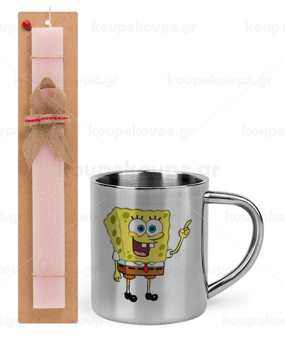 Μπομπ Σφουγγαράκης character, Πασχαλινή Λαμπάδα με μεταλλική κούπα θερμό (300ml) & κερί αρωματικό πλακέ (30cm) (ΡΟΖ)