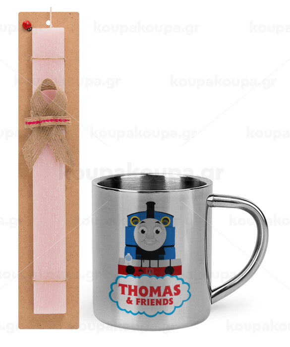 Τόμας το τρενάκι, Πασχαλινή Λαμπάδα με μεταλλική κούπα θερμό (300ml) & κερί αρωματικό πλακέ (30cm) (ΡΟΖ)