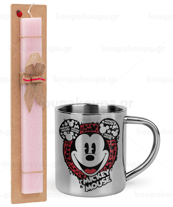 Mickey Mouse, Πασχαλινή Λαμπάδα με μεταλλική κούπα θερμό (300ml) & κερί αρωματικό πλακέ (30cm) (ΡΟΖ)