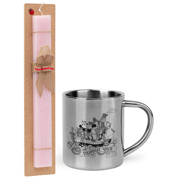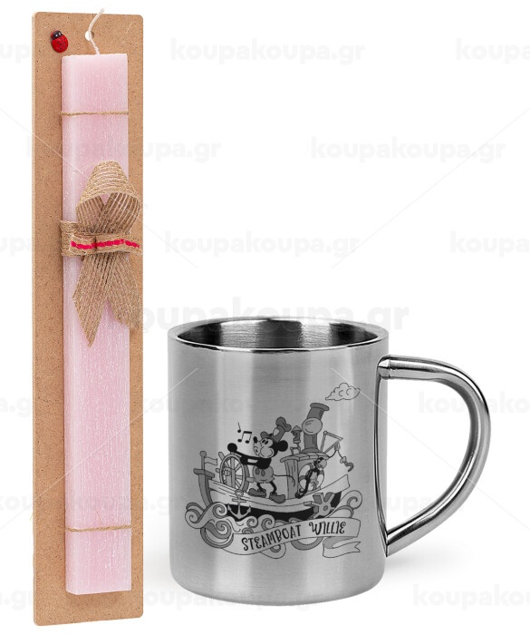 Mickey steamboat, Πασχαλινή Λαμπάδα με μεταλλική κούπα θερμό (300ml) & κερί αρωματικό πλακέ (30cm) (ΡΟΖ)