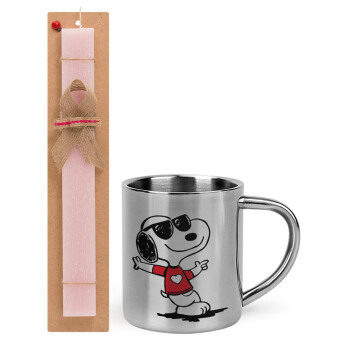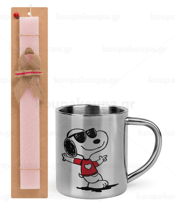 Snoopy καρδούλα, Πασχαλινή Λαμπάδα με μεταλλική κούπα θερμό (300ml) & κερί αρωματικό πλακέ (30cm) (ΡΟΖ)