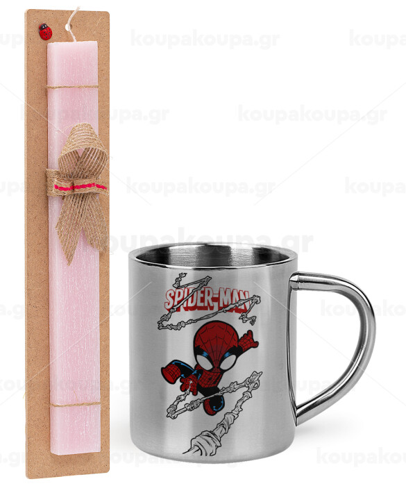 Spiderman kid, Πασχαλινή Λαμπάδα με μεταλλική κούπα θερμό (300ml) & κερί αρωματικό πλακέ (30cm) (ΡΟΖ)