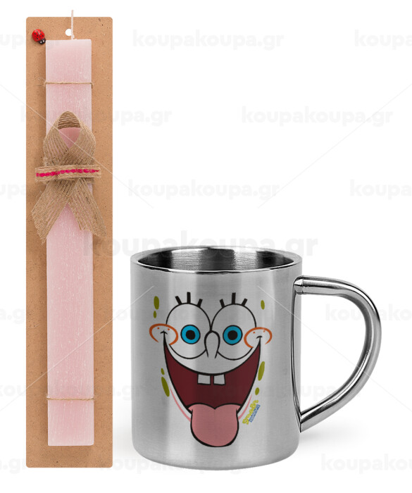 Μπομπ Σφουγγαράκης χαμόγελο, Πασχαλινή Λαμπάδα με μεταλλική κούπα θερμό (300ml) & κερί αρωματικό πλακέ (30cm) (ΡΟΖ)
