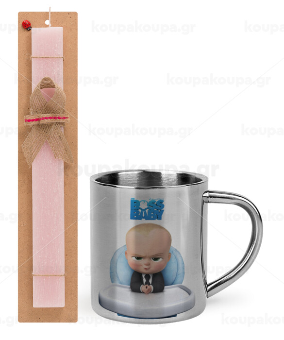 The boss baby, Πασχαλινή Λαμπάδα με μεταλλική κούπα θερμό (300ml) & κερί αρωματικό πλακέ (30cm) (ΡΟΖ)