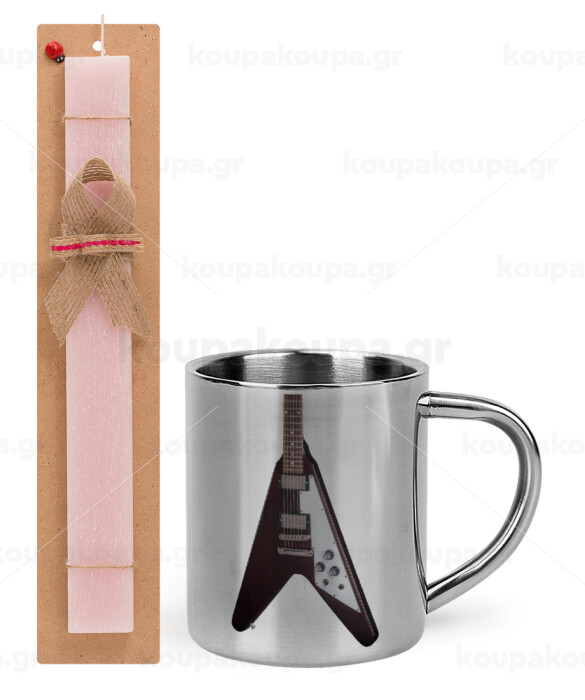 Guitar flying V, Πασχαλινή Λαμπάδα με μεταλλική κούπα θερμό (300ml) & κερί αρωματικό πλακέ (30cm) (ΡΟΖ)