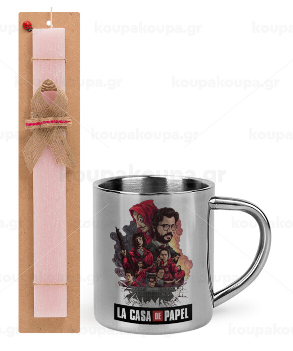 La casa de papel drawing cover, Πασχαλινή Λαμπάδα με μεταλλική κούπα θερμό (300ml) & κερί αρωματικό πλακέ (30cm) (ΡΟΖ)