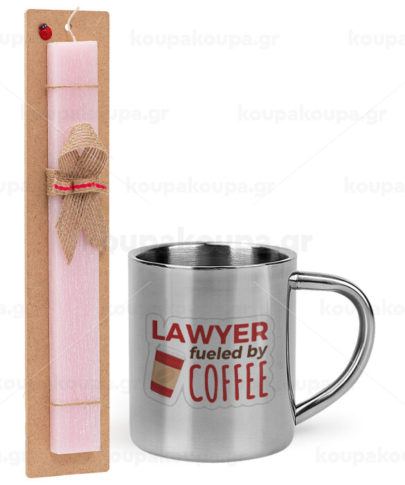 Lawyer fueled by coffee, Πασχαλινή Λαμπάδα με μεταλλική κούπα θερμό (300ml) & κερί αρωματικό πλακέ (30cm) (ΡΟΖ)
