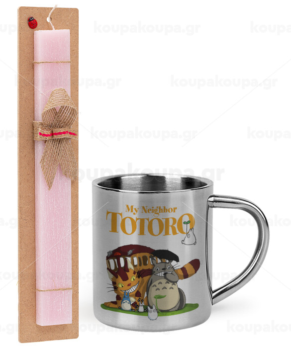 Totoro and Cat, Πασχαλινή Λαμπάδα με μεταλλική κούπα θερμό (300ml) & κερί αρωματικό πλακέ (30cm) (ΡΟΖ)