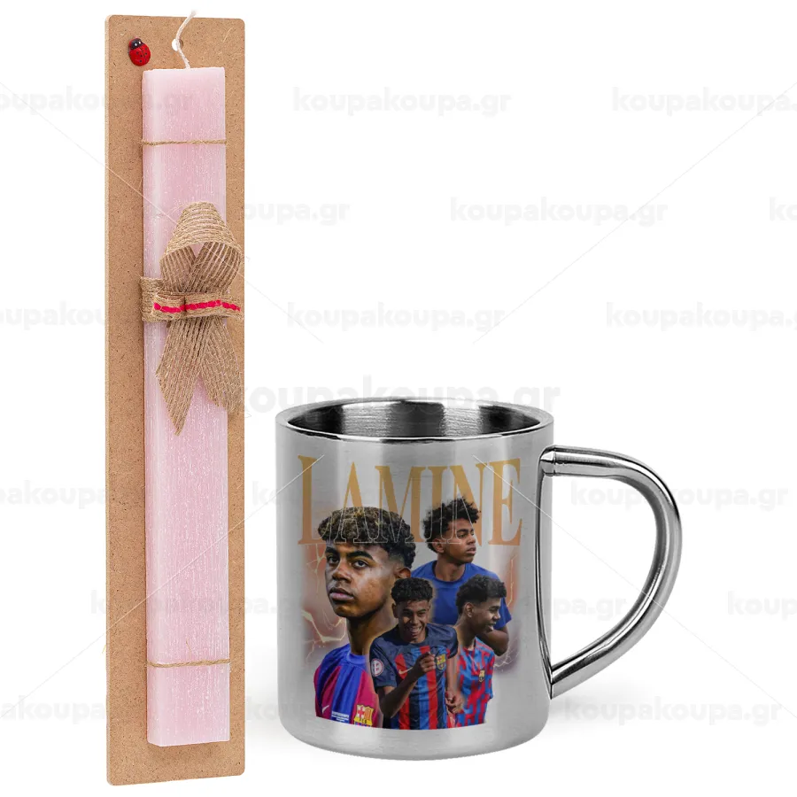 lamine yamal FCB, Πασχαλινή Λαμπάδα με μεταλλική κούπα θερμό (300ml) & κερί αρωματικό πλακέ (30cm) (ΡΟΖ)