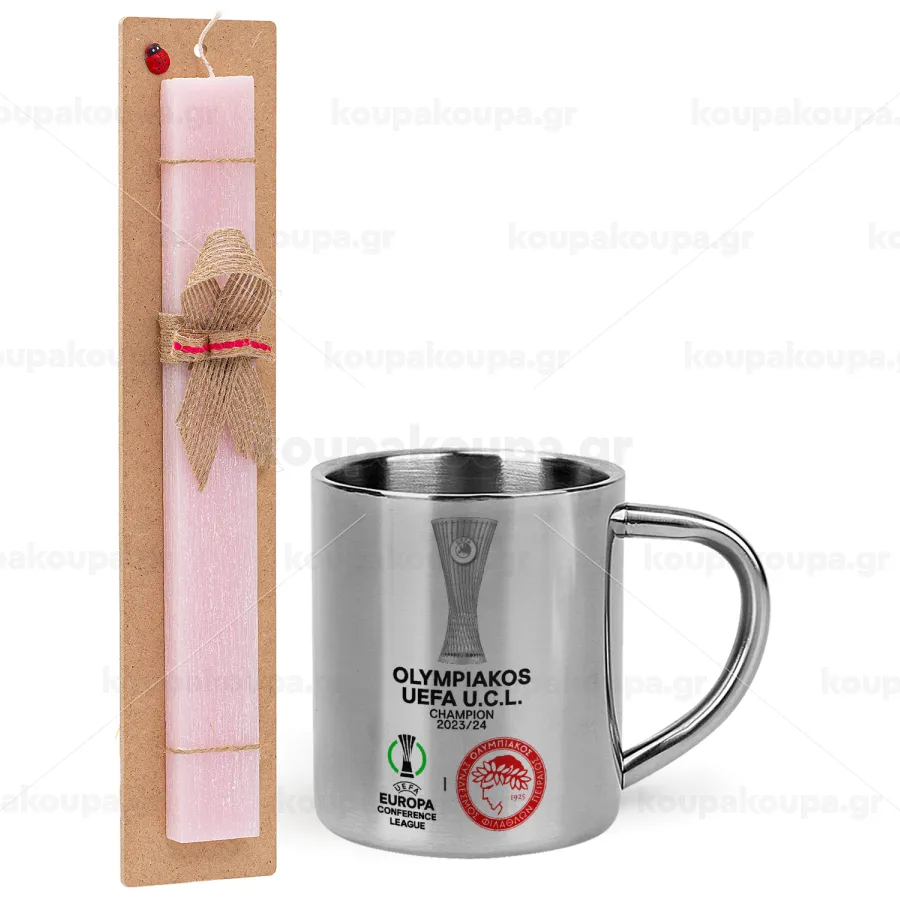 Ολυμπιακός νικητής UEFA Europa Conference League Champion 2023/24, Πασχαλινή Λαμπάδα με μεταλλική κούπα θερμό (300ml) & κερί αρωματικό πλακέ (30cm) (ΡΟΖ)