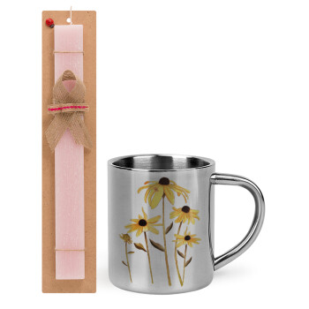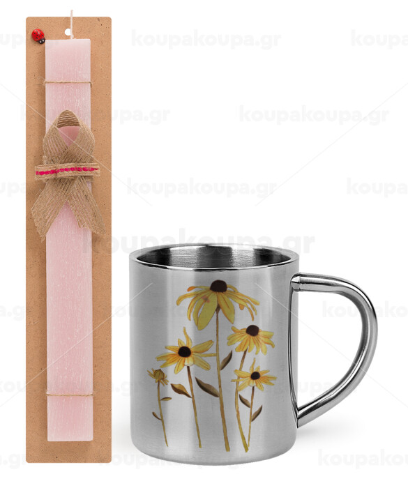 Daisies flower, Πασχαλινή Λαμπάδα με μεταλλική κούπα θερμό (300ml) & κερί αρωματικό πλακέ (30cm) (ΡΟΖ)