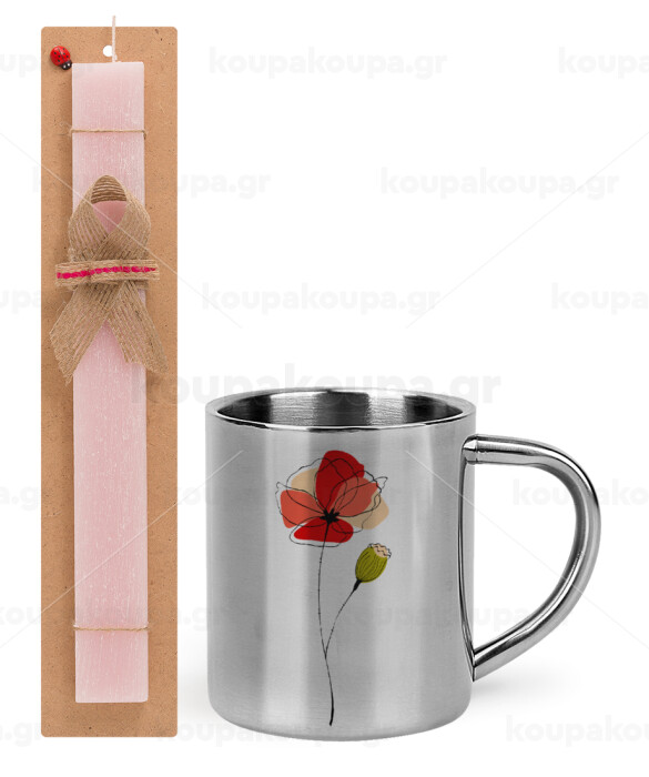 Red poppy flowers papaver, Πασχαλινή Λαμπάδα με μεταλλική κούπα θερμό (300ml) & κερί αρωματικό πλακέ (30cm) (ΡΟΖ)