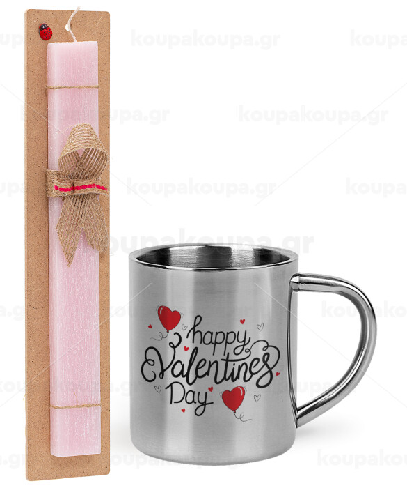Happy Valentines Day!!!, Πασχαλινή Λαμπάδα με μεταλλική κούπα θερμό (300ml) & κερί αρωματικό πλακέ (30cm) (ΡΟΖ)