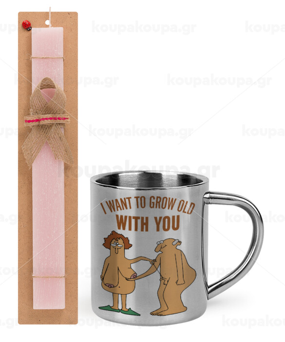 I want to grow old with you, Πασχαλινή Λαμπάδα με μεταλλική κούπα θερμό (300ml) & κερί αρωματικό πλακέ (30cm) (ΡΟΖ)