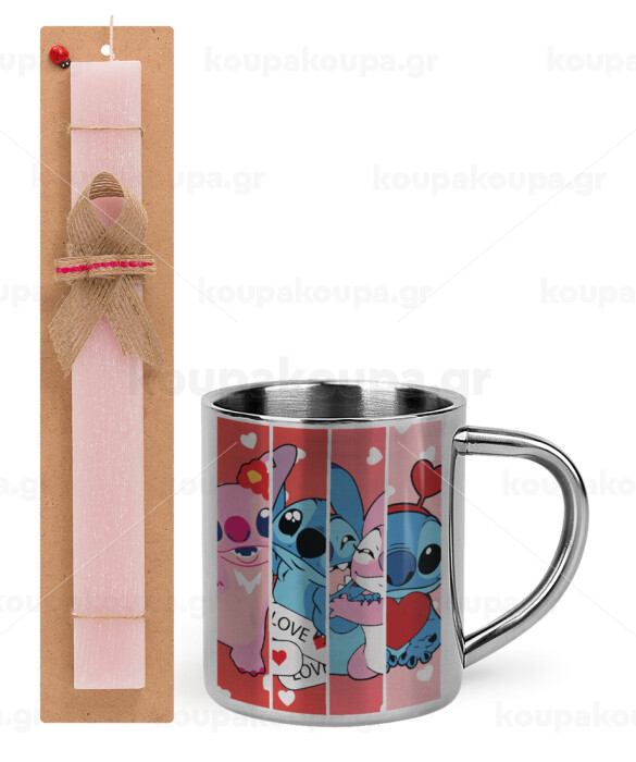 Lilo & Stitch Love, Πασχαλινή Λαμπάδα με μεταλλική κούπα θερμό (300ml) & κερί αρωματικό πλακέ (30cm) (ΡΟΖ)