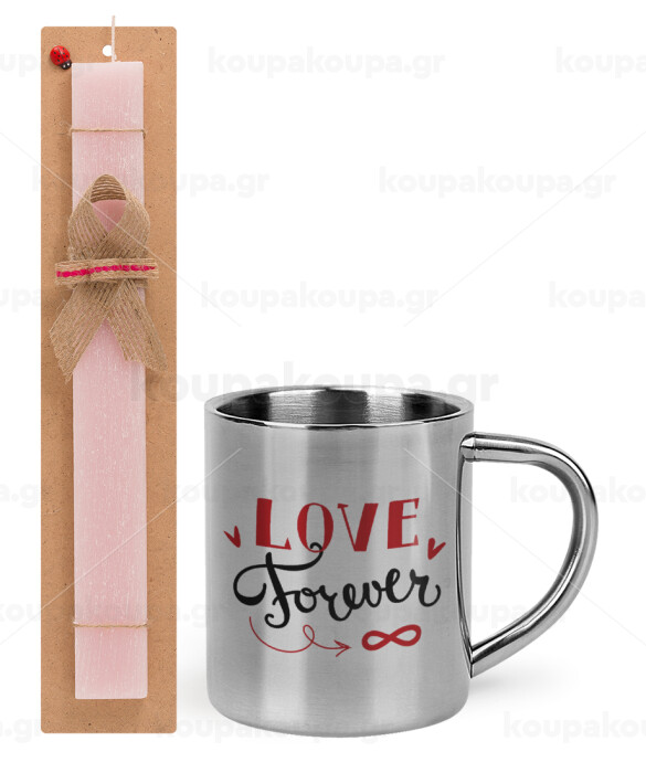 Love forever ∞, Πασχαλινή Λαμπάδα με μεταλλική κούπα θερμό (300ml) & κερί αρωματικό πλακέ (30cm) (ΡΟΖ)