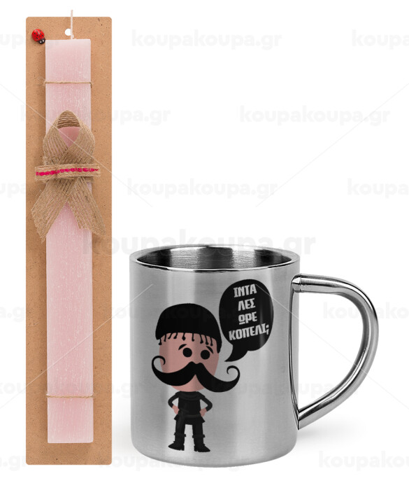 Κρητικός "Ίντα λες ωρέ κοπέλι", Πασχαλινή Λαμπάδα με μεταλλική κούπα θερμό (300ml) & κερί αρωματικό πλακέ (30cm) (ΡΟΖ)