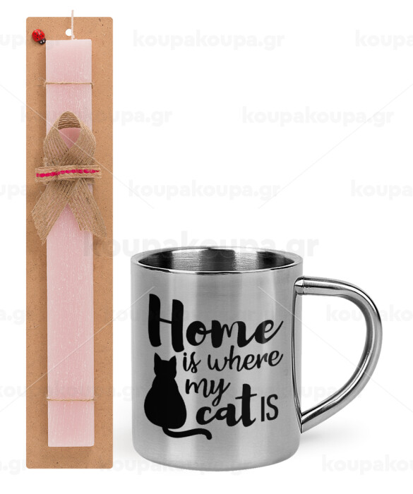 Home is where my cat is!, Πασχαλινή Λαμπάδα με μεταλλική κούπα θερμό (300ml) & κερί αρωματικό πλακέ (30cm) (ΡΟΖ)