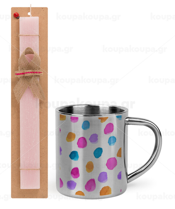Watercolor dots, Πασχαλινή Λαμπάδα με μεταλλική κούπα θερμό (300ml) & κερί αρωματικό πλακέ (30cm) (ΡΟΖ)