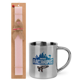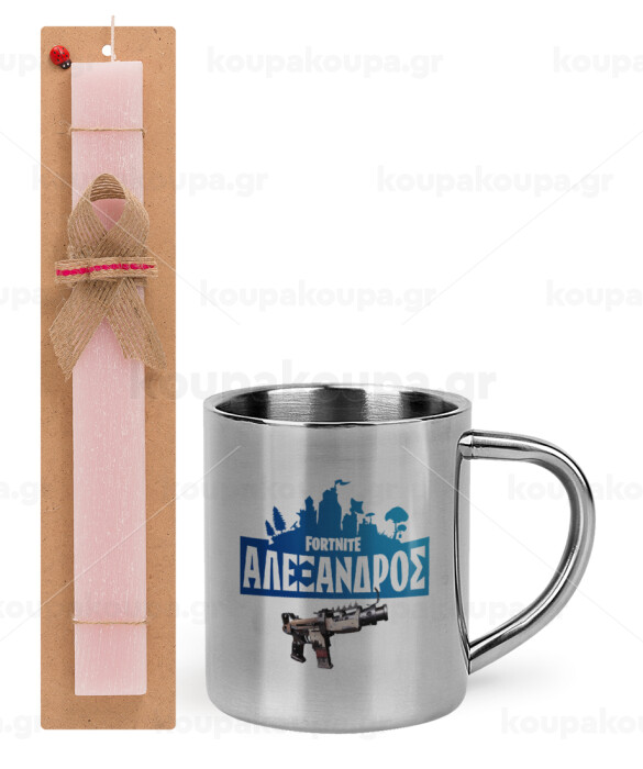 Fortnite with gun με το όνομα σου, Πασχαλινή Λαμπάδα με μεταλλική κούπα θερμό (300ml) & κερί αρωματικό πλακέ (30cm) (ΡΟΖ)