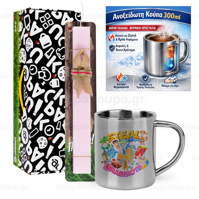 Roblox Steal a Brainrot, Πασχαλινή Λαμπάδα με μεταλλική κούπα θερμό (300ml) & κερί αρωματικό πλακέ (30cm) (ΡΟΖ)