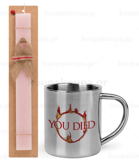You Died | Dark Souls, Πασχαλινή Λαμπάδα με μεταλλική κούπα θερμό (300ml) & κερί αρωματικό πλακέ (30cm) (ΡΟΖ)