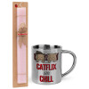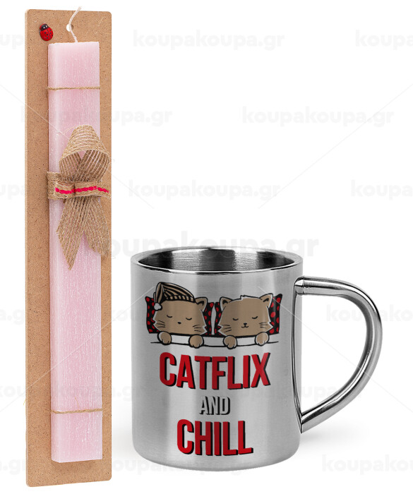 Catflix and Chill, Πασχαλινή Λαμπάδα με μεταλλική κούπα θερμό (300ml) & κερί αρωματικό πλακέ (30cm) (ΡΟΖ)