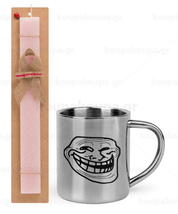 Troll face, Πασχαλινή Λαμπάδα με μεταλλική κούπα θερμό (300ml) & κερί αρωματικό πλακέ (30cm) (ΡΟΖ)