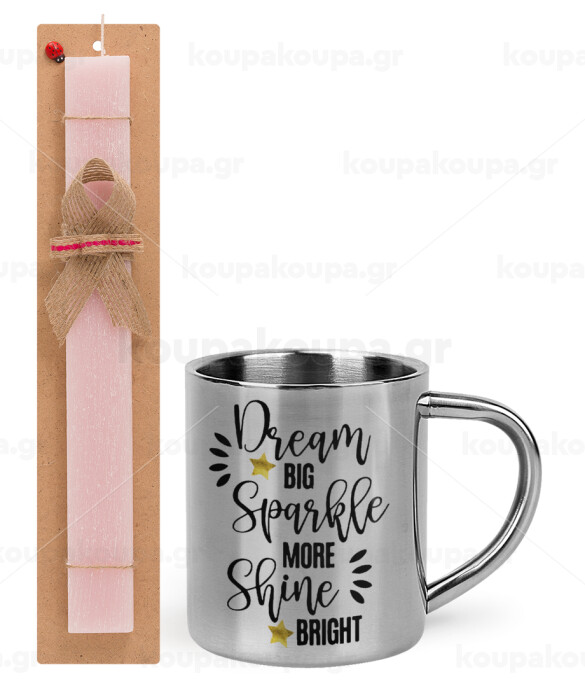 Dream big, Sparkle more, Shine bright, Πασχαλινή Λαμπάδα με μεταλλική κούπα θερμό (300ml) & κερί αρωματικό πλακέ (30cm) (ΡΟΖ)