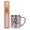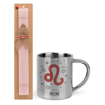 Ζώδια Λέων, Πασχαλινή Λαμπάδα με μεταλλική κούπα θερμό (300ml) & κερί αρωματικό πλακέ (30cm) (ΡΟΖ)