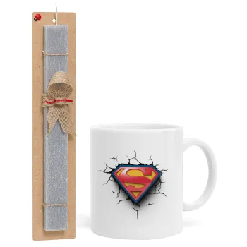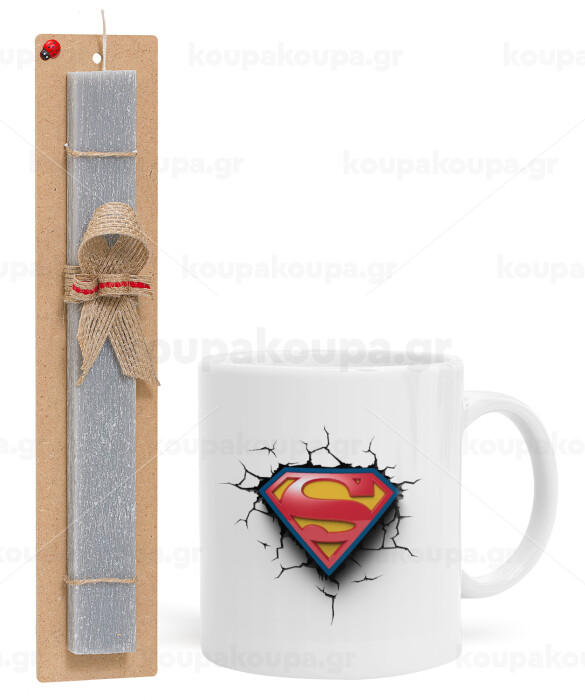 Superman cracked, Πασχαλινή Λαμπάδα με Κούπα κεραμική (330ml) & κερί αρωματικό πλακέ (30cm) (ΓΚΡΙ)