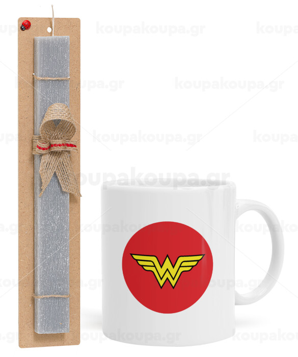 Wonder woman, Πασχαλινή Λαμπάδα με Κούπα κεραμική (330ml) & κερί αρωματικό πλακέ (30cm) (ΓΚΡΙ)
