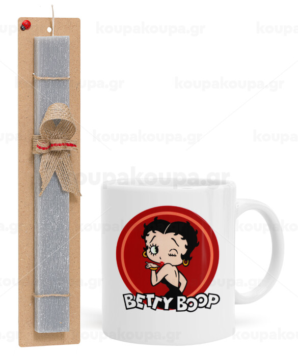 Betty Boop kiss, Πασχαλινή Λαμπάδα με Κούπα κεραμική (330ml) & κερί αρωματικό πλακέ (30cm) (ΓΚΡΙ)