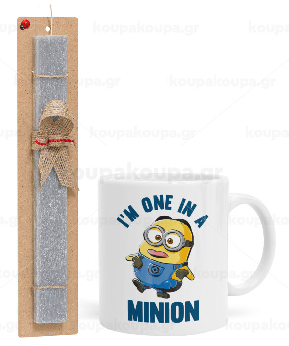 I'm one in a minion, Πασχαλινή Λαμπάδα με Κούπα κεραμική (330ml) & κερί αρωματικό πλακέ (30cm) (ΓΚΡΙ)