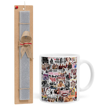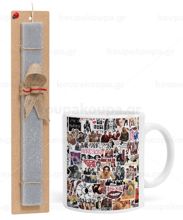 Maneskin stickers, Πασχαλινή Λαμπάδα με Κούπα κεραμική (330ml) & κερί αρωματικό πλακέ (30cm) (ΓΚΡΙ)