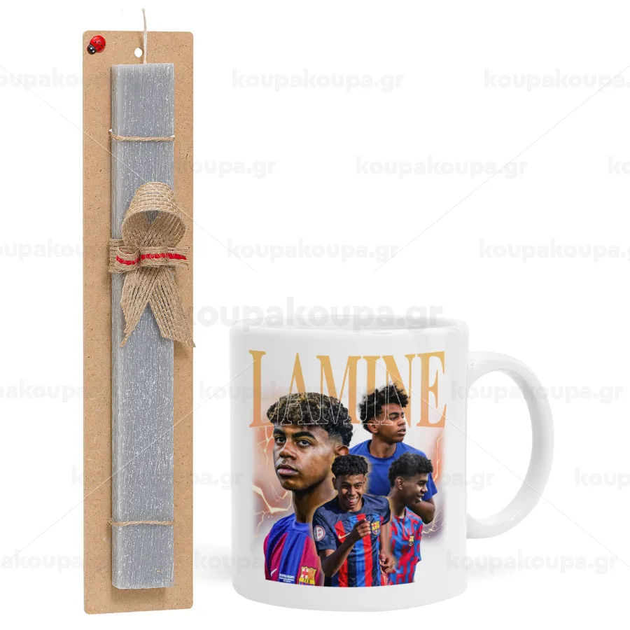lamine yamal FCB, Πασχαλινή Λαμπάδα με Κούπα κεραμική (330ml) & κερί αρωματικό πλακέ (30cm) (ΓΚΡΙ)